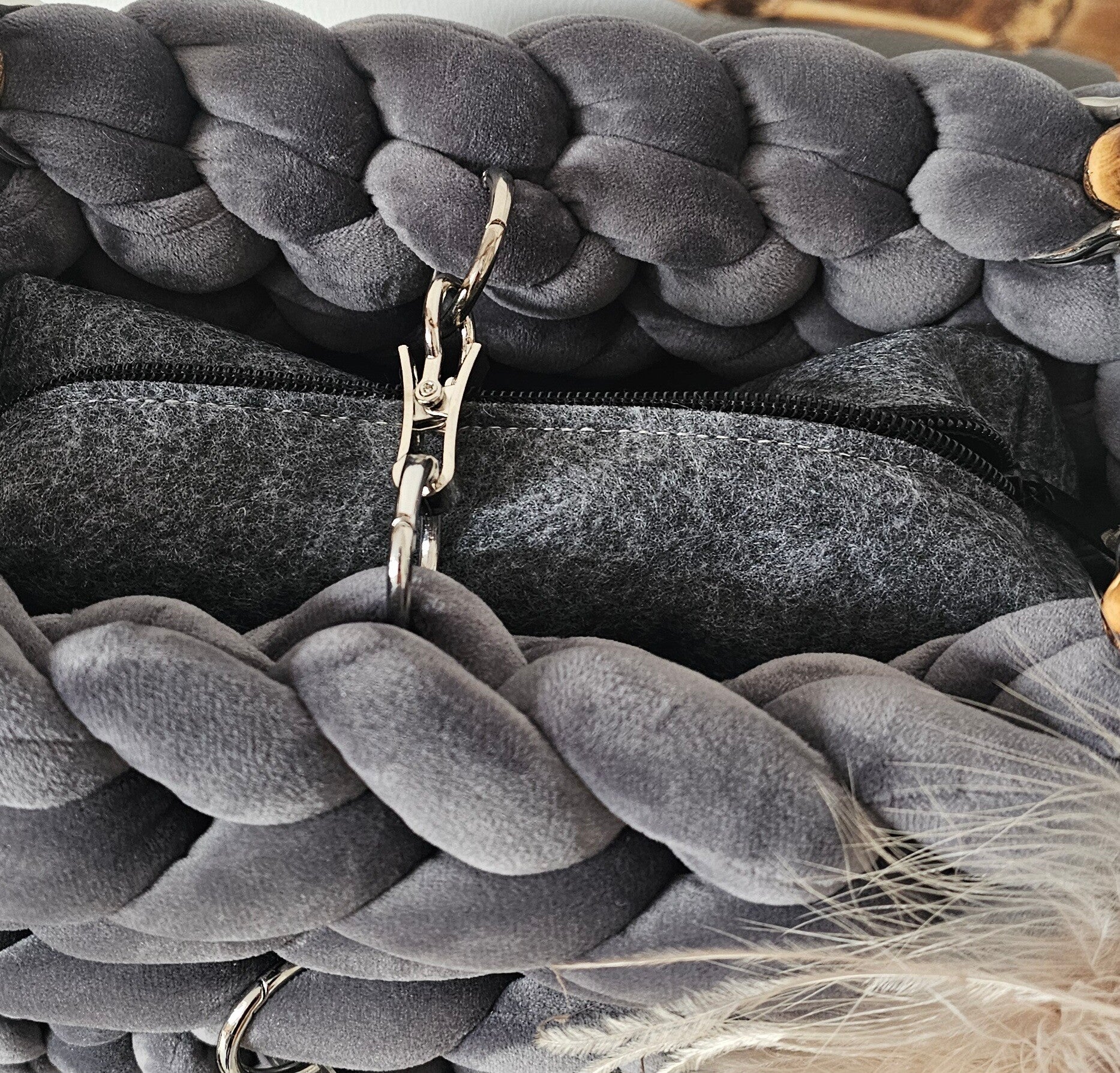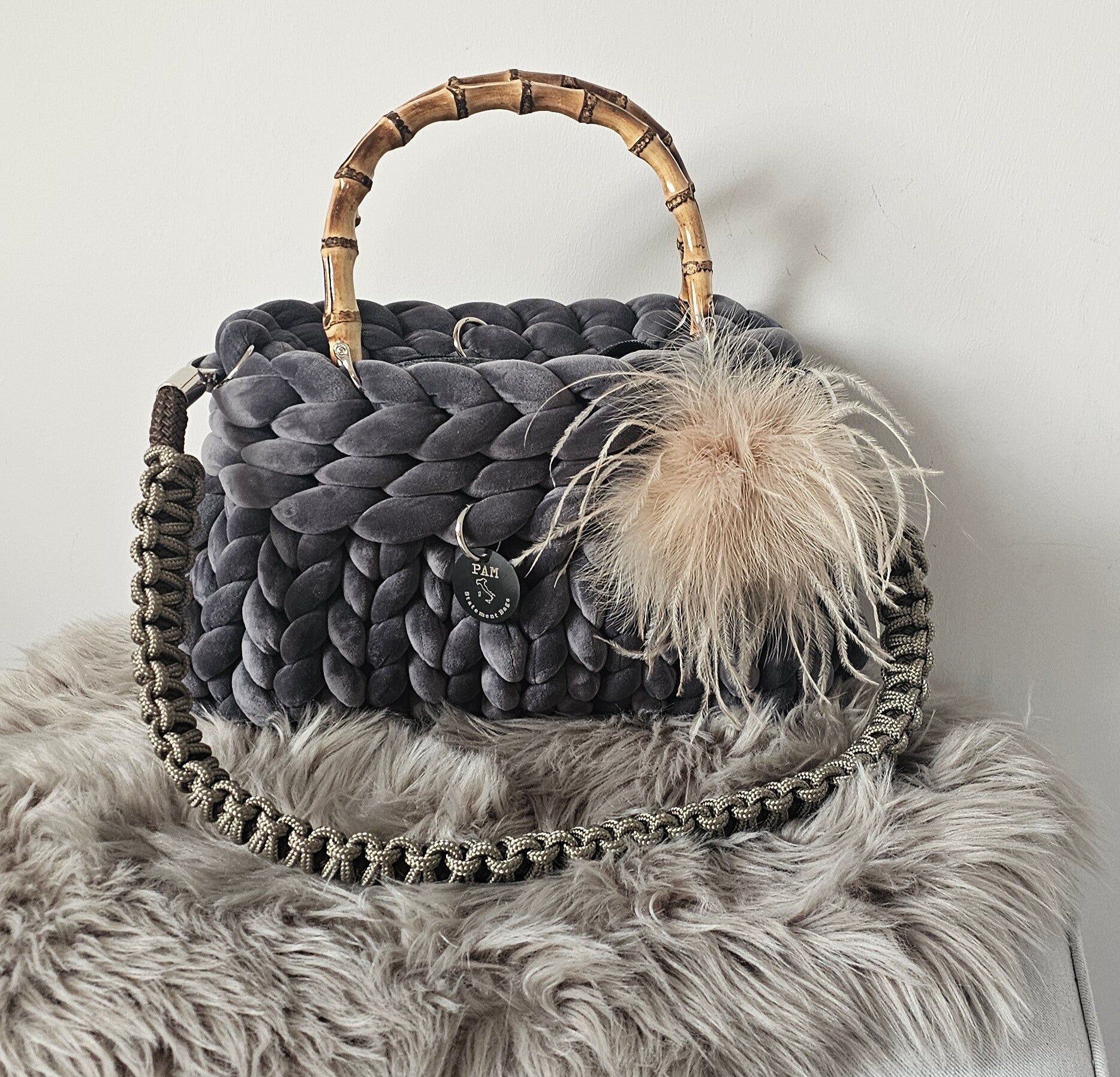 Stricktasche in Grau Samtoptik. Bambusgriff und Paracordgurt geflochten.
