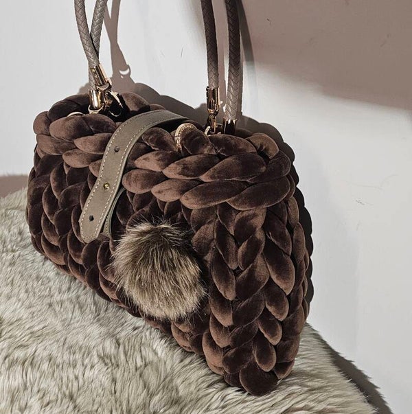 Stricktasche in dunkelbrauner Samtoptik mit edlem Lederverschluß.