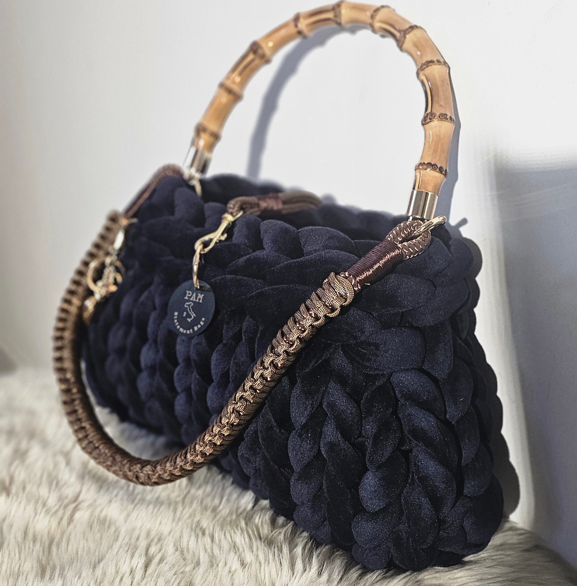 Edle dunkelblaue Stricktasche in Samtoptik