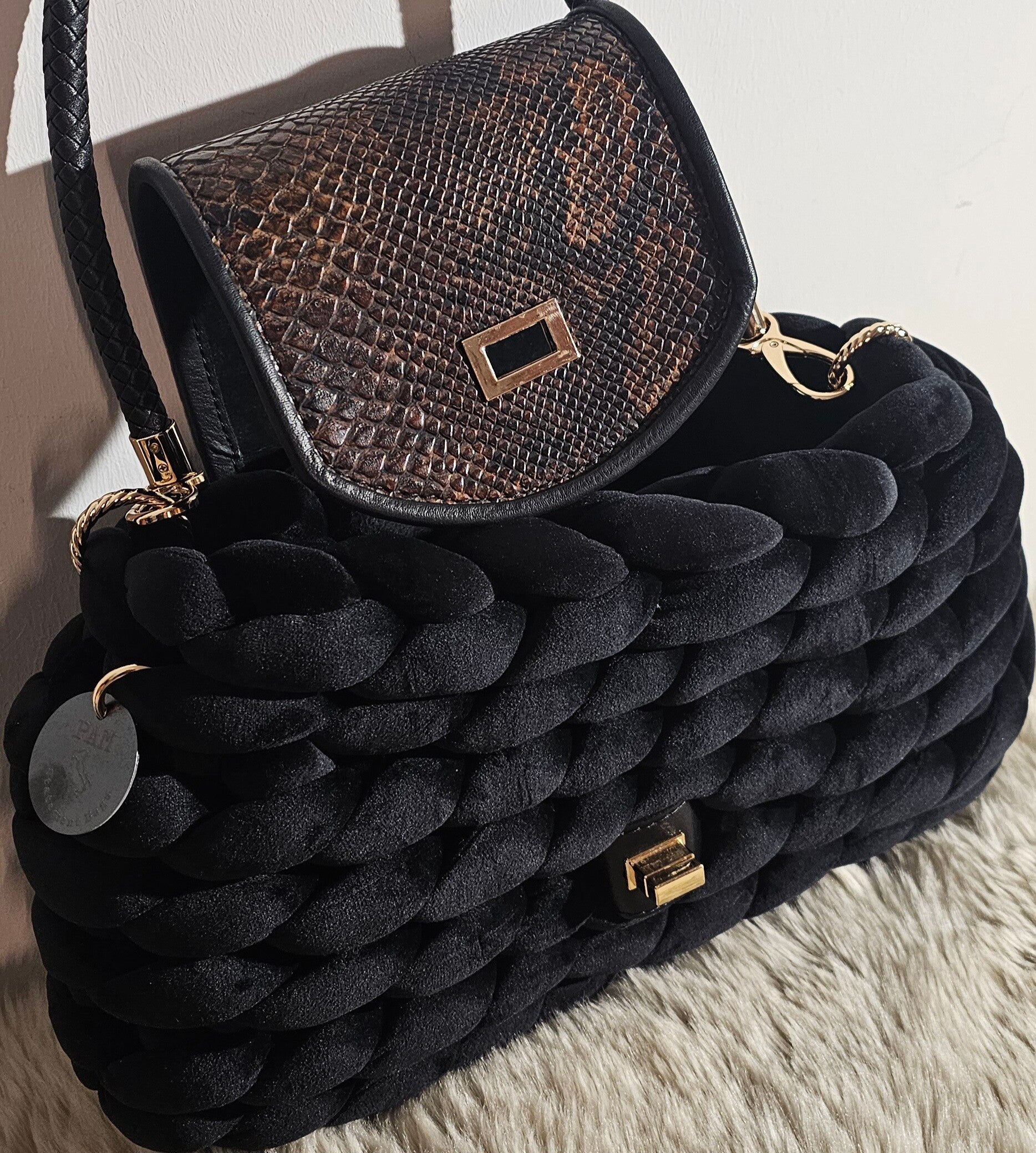 Edle Stricktasche in schwarz Samtoptik mit edler Lederklappe in Schlangenoptik. Tragegriff 60 cm - auch für die Schulter geeignet