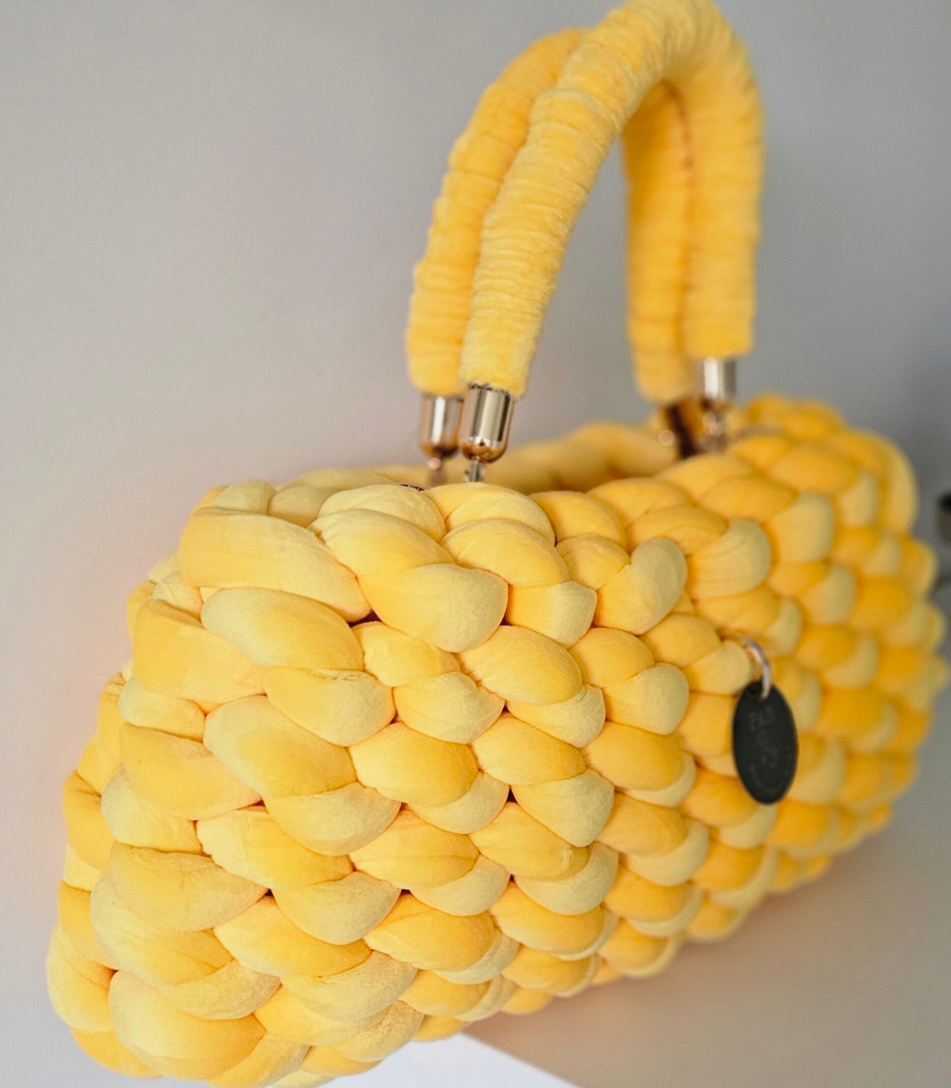 Trendige gelbe Stricktasche mit gleichfarbigen Henkeln